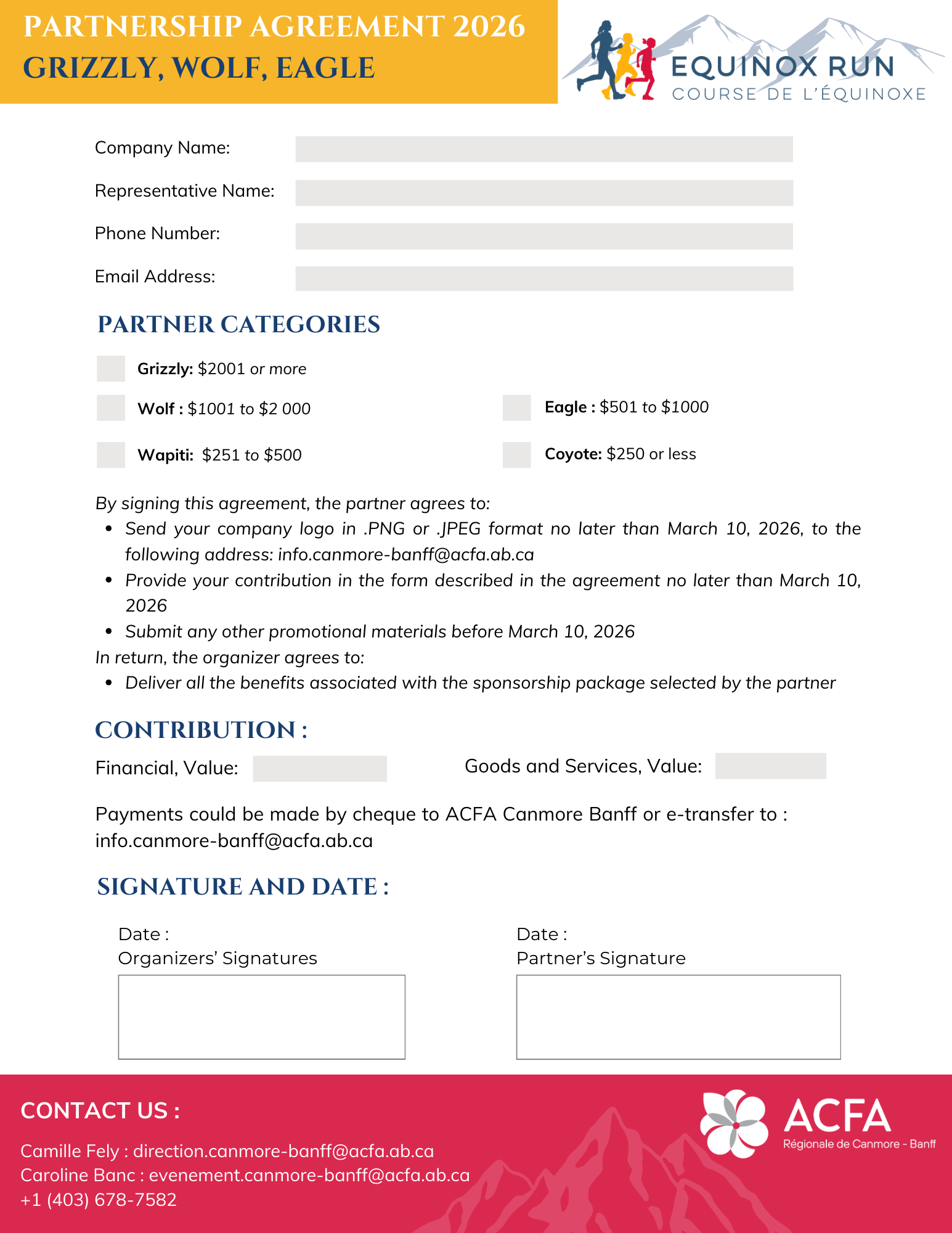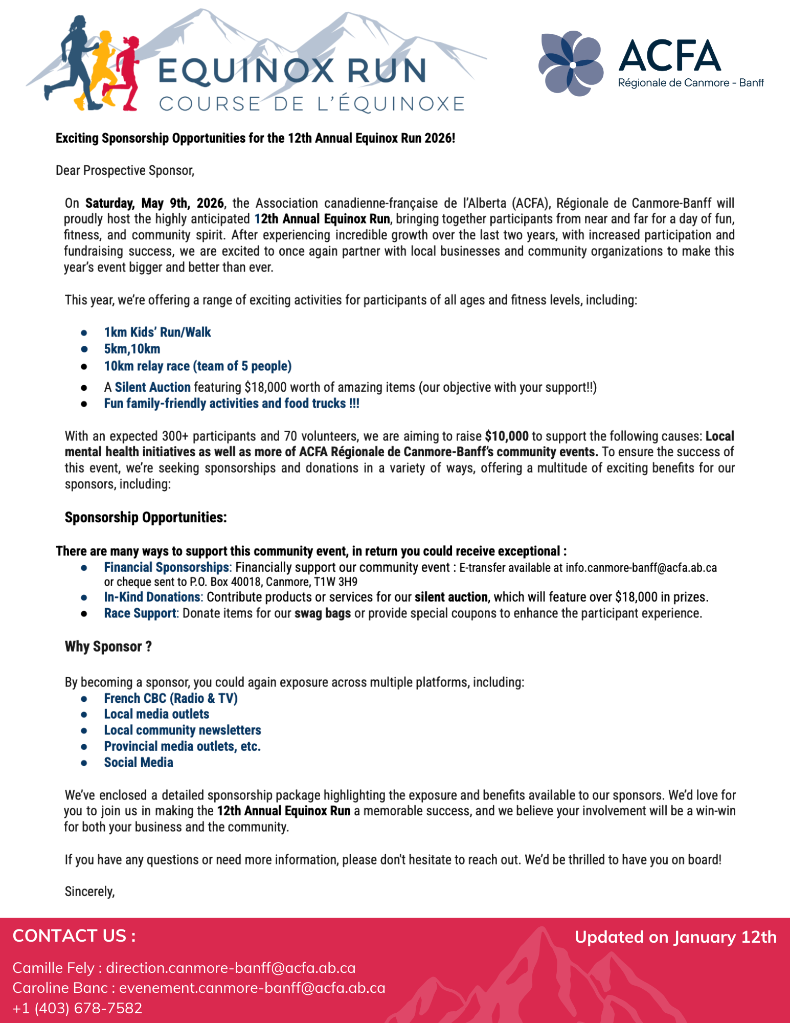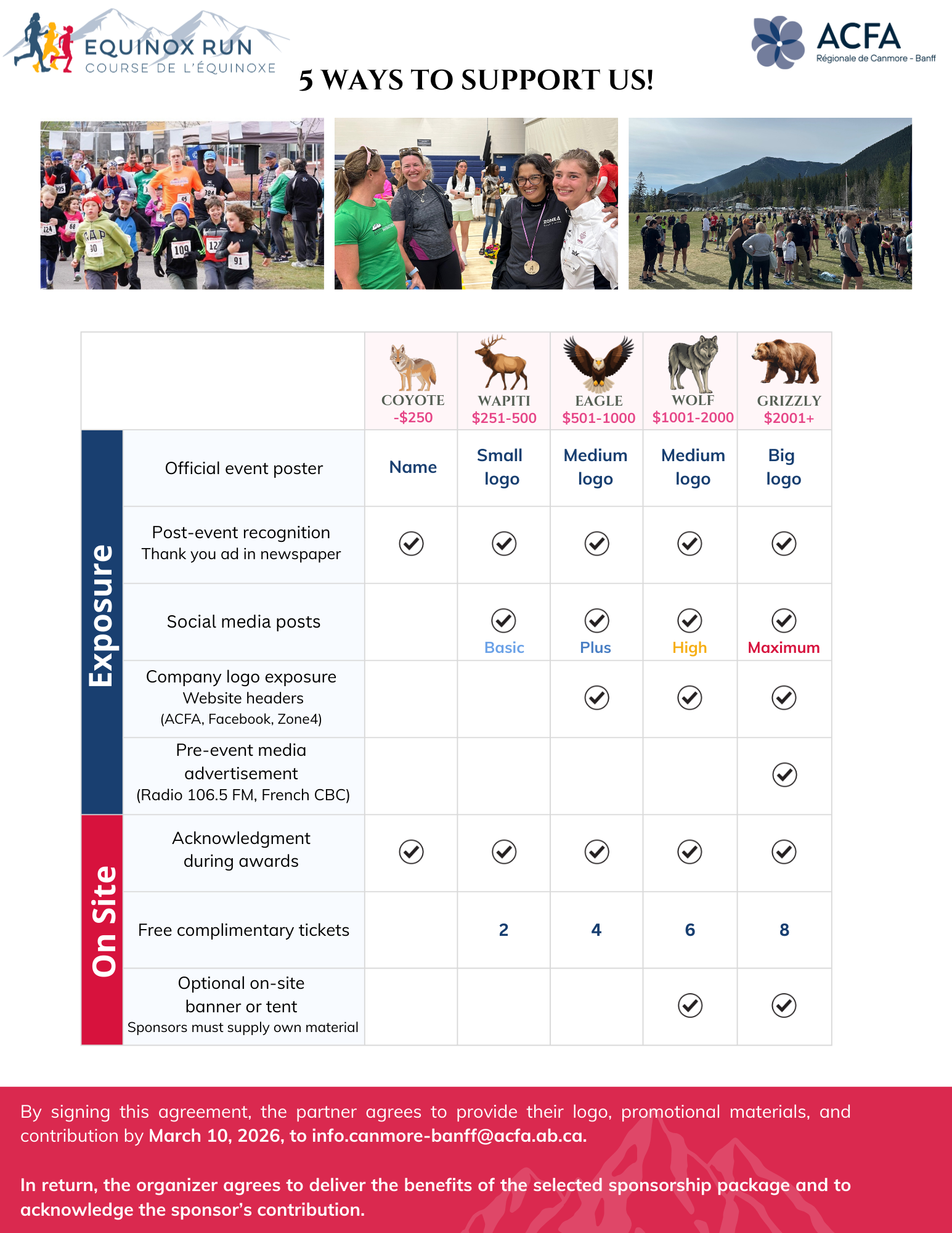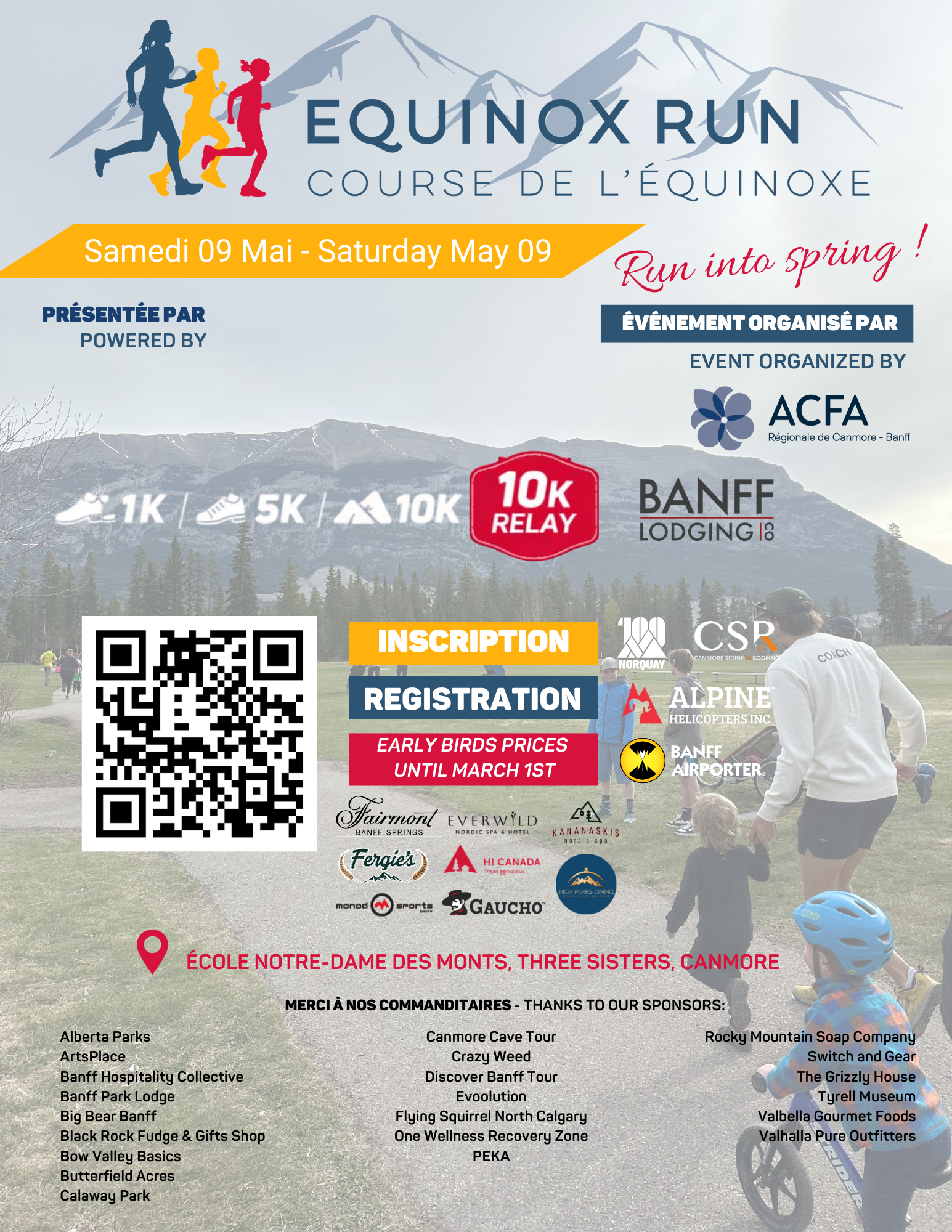 La Course de l’Équinoxe, organisée par l’ACFA Canmore-Banff, est de retour pour une 12e édition, et nous invitons les entreprises locales à prendre part à cet événement communautaire rassembleur! 🏃♀️🏃♂️
